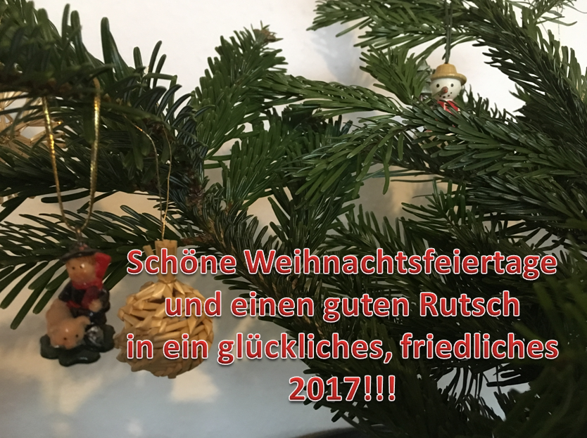 In diesem Sinne wünsche ich Euch allen von Herzen frohe Weihnachtsfeiertage und einen guten Rutsch ins neue Jahr 2017! Auf dass es uns allen Frieden, Gesundheit, Gerechtigkeit und Glück bringt!